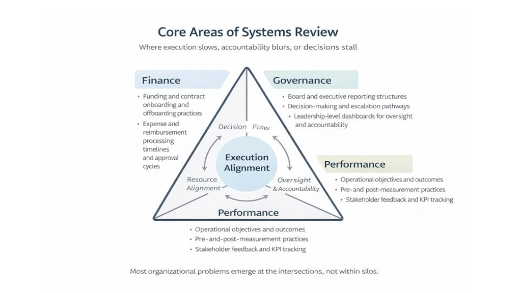 This framework highlights where system strain emerges across finance, governance, and performance, often at their intersections rather than in isolation.